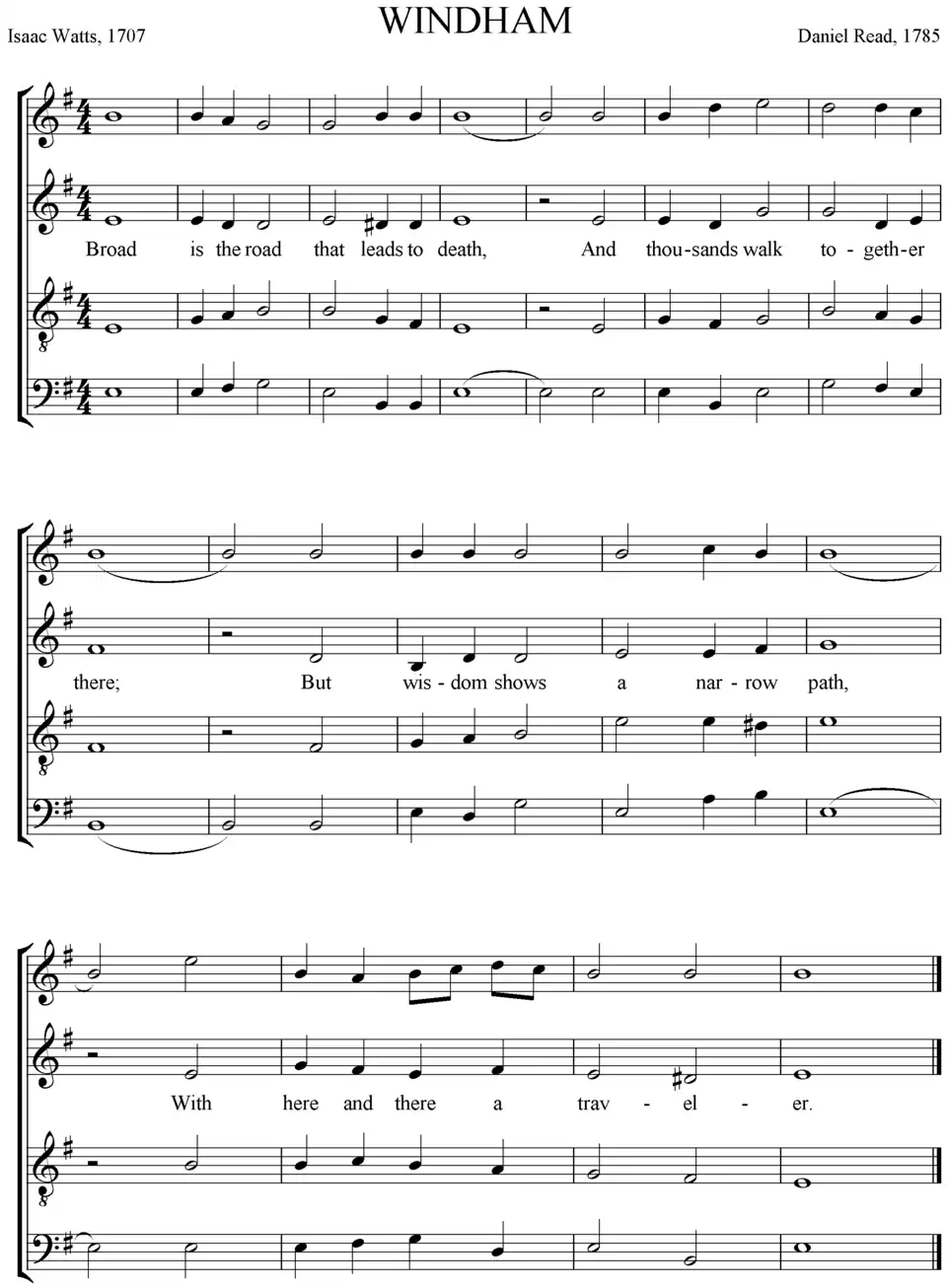 Read, along with his contemporaries William Billings, Oliver Holden, Supply Belcher, and Justin Morgan, was one of the primary members of a group of American composers called the Yankee tunesmiths or the First New England School. While the classical music era was in its heyday in Europe, American composers of "serious" music were setting hymn tunes in three- and four-part a cappella style, with simple folklike melodies and little regard for functional harmony. Many of these works were fuguing tunes, which begin with all voices singing together (with a melody usually based on a Protestant hymn), come to a stop, and continue with each voice entering one at a time. Nearly all were hymn tunes, developed for the use of the newly-forming singing societies.