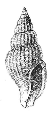 The color of the whitish or straw shell is variegated with darker maculations on some examples. The shell is elegantly fusiform. It contains 8 whorls. These are rounded but much impressed at the sutures. The two almost vitreous whorls in the protoconch are most delicately decussate. The remainder of the whorls are closely obliquely ribbed, crossed by many spirals, slightly gemmulate at the points of junction. This gives a white shining appearance to the ribs, which on the body whorl number about twenty-six. The aperture is oval. The outer lip is thickened. The sinus is very superficial, but broad, close below the suture. The siphonal canal is slightly recurved and short. [2]