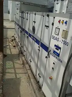 A dehumidifier is an air conditioning device which reduces and maintains the level of humidity in the air.[1] This is done usually for health or thermal comfort reasons or to eliminate musty odor and to prevent the growth of mildew by extracting water from the air. It can be used for household, commercial, or industrial applications. Large dehumidifiers are used in commercial buildings such as indoor ice rinks[2] and swimming pools, as well as manufacturing plants or storage warehouses. Typical air conditioning systems combine dehumidification with cooling, by operating cooling coils below the dewpoint and draining away the water that condenses.