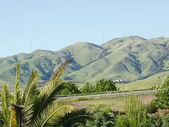 The Diablo Range extends from the Carquinez Strait in the north to Orchard Peak and Polonio Pass in the south, near the point where State Route 46 crosses over the Coast Ranges at Cholame, as described by the United States Geological Survey (USGS). It is bordered on the northeast by the San Joaquin River, on the southeast by the San Joaquin Valley, on the southwest by the Salinas River, and on the northwest by the Santa Clara Valley and San Francisco Bay.[1] On USGS maps, the "Diablo Range" is shown as the ridgeline which runs between its namesake Mount Diablo southeastward past Mount Hamilton. However, the USGS Geographic Names Information System (GNIS) includes the East Bay Hills in its list of various GPS coordinates for the Diablo Range. Although not formally recognized by USGS GNIS, the East Bay Hills consists of the Briones Hills[2] furthest north, then the Berkeley Hills,[3] the San Leandro Hills[4] centrally, and Walpert Ridge[5] and Pleasanton Ridge[6] to the southwest and southeast, culminating at Alameda Creek/Highway 84.