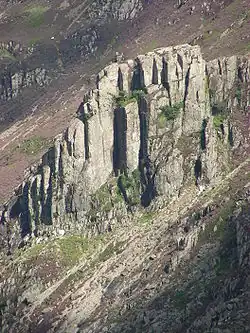 Dinas Cromlech or Dinas y Gromlech is a distinctive rhyolite rock outcrop at the Llanberis Pass, in Snowdonia, northwest Wales, which has a distinctive "open book" shape that is clearly visible from the road (A4086), and is very popular location for rock climbers and contains some of Britain's most famous and notable rock climbing routes, several of which are important in the history of rock climbing.[2]