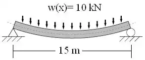 Take the beam shown at right supported by a fixed pin at the left and a roller at the right. There are no applied moments, the weight is a constant 10 kN, and - due to symmetry - each support applies a 75 kN vertical force to the beam. Taking x as the distance from the pin,