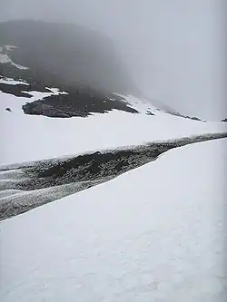 Cones can also be found on snow patches. Many snow patches contain a certain amount of debris on them, blown in on the wind. Typically, this is a course grained sand or organic material. The sand is quite porous which makes it a poor conductor of heat. During extreme wind events, this sand or organic matter is carried onto the snow patch. The snow lying underneath the porous sand is protected from the heat and does not erode away. The snow not protected by a layer of sand or organic matter begins to erode through ablation. The protected areas accumulate more sand and eventually take on a conical shape. The core of snow is protected from ablation while the surrounding snow patch continues to melt. This is another way dirt cones can form.[1]