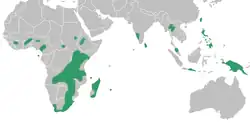Disperis consists of two subgenera, Disperis and Dryorkis.[5] Subgenus Disperis has been well sampled in a molecular phylogenetic study,[6] but subgenus Dryorkis has not. Subgenus Disperis has about 30 species and is distinguished by an entire lip appendage. Most of its species are from southern Africa. A few are from East Africa and Madagascar. Subgenus Dryorkis has about 48 species and is distinguished by a 2-lobed lip appendage. It is found throughout tropical Africa as well as Madagascar and nearby islands, and it has one widespread species in tropical Asia.