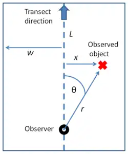 Objects are detected out to a pre-determined maximum detection distance w. Not all objects within w will be detected, but a fundamental assumption is that all objects at zero distance (i.e., on the line itself) are detected. Overall detection probability is thus expected to be 1 on the line, and to decrease with increasing distance from the line. The distribution of the observed distances is used to estimate a "detection function" that describes the probability of detecting an object at a given distance. Given that various basic assumptions hold, this function allows the estimation of the average probability P of detecting an object given that is within width w of the line. Object density can then be estimated as D = n / (P*a), where n is the number of objects detected and a is the size of the region covered (total length of the transect (L) multiplied by 2w).