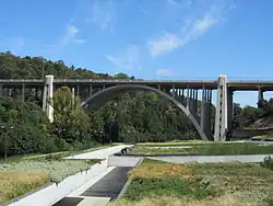 Pacheco's name remains well known to the people of Lisbon as the viaduct that crosses the Alcântara Valley, connecting the A5 motorway to the centre of Lisbon, bears his name. There is a monument to him on the western edge of the viaduct and one in his home town of Loulé, inaugurated by Salazar on the 10th anniversary of Pacheco's death. The memorial contains 18 scenes sculpted in stone, which portray the areas of civil engineering on which Pacheco had an influence. In Loulé there is also a plaque on the house where he was born. A bridge over the Tâmega river is also named after him, as are several roads.[3][7]