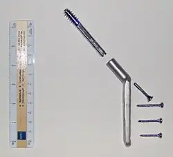 Dynamic hip screw (DHS) or Sliding Screw Fixation is a type of orthopaedic implant designed for fixation of certain types of hip fractures which allows controlled dynamic sliding of the femoral head component along the construct. It is the most commonly used implant for extracapsular fractures of the hip,[1] which are common in older osteoporotic patients. There are 3 components of a dynamic hip screw, including a lag screw (inserted into the neck of the femur), a sideplate and several cortical screws (fixated into the proximal femoral shaft). The idea behind the dynamic compression is that the femoral head component is allowed to move along one plane; since bone responds to dynamic stresses, the native femur may undergo primary healing: cells join along boundaries, resulting in a robust joint requiring no remodeling.
