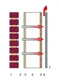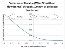 Insulations such as polyurethane (PUR) boards, which due to their micro-structure, are not air permeable are not suitable for dynamic insulation. Insulations such as rock wool, glass wool, sheep's wool, cellulose are all air permeable and so can be used in a dynamically insulated envelope. In equation (1) the air speed through the insulation, u is taken as positive when the air flow is in the opposite direction to the conductive heat flow (contra-flux). Equation (1) also applies to steady state heat flow in multi-layered walls.[3]