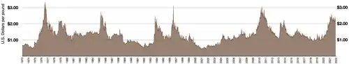 According to the Composite Index of the London-based coffee export country group International Coffee Organization the monthly coffee price averages in international trade had been well above 1000 US cent/lb during the 1920s and 1980s, but then declined during the late 1990s reaching a minimum in September 2001 of just 417 US cent per lb and stayed low until 2004. The reasons for this decline included a collapse of the International Coffee Agreement of 1962–1989[12] with Cold War pressures, which had held the minimum coffee price at US$1.20 per pound.