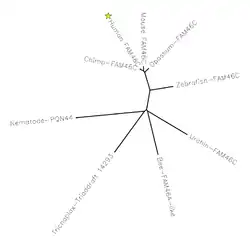 Based on multiple sequence alignments generated by ClustalW an unrooted phylogenetic tree was generated for select FAM46C orthologs to demonstrate the diverse occurrences of FAM46C-like genes throughout the current evolutionary catalog. For posterity, many orthologs were omitted (see ortholog table above; many were omitted from this table also).