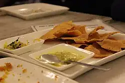 To create fafda, gram flour, oil, carom seeds (ajwain), papad khar and salt are mixed in a bowl. A dough is made from the mixture using enough water. Small balls of the dough are rolled into a cylindrical shape, and after flattening, deep-fried till they turn crispy. On festival days, the shops that make fafda can have lines that start at 4 am. [3] It is served with a chutney and salty fried-green chilis. Fafda is also accompanied with spicy shredded vegetables colloquially called "sambharo". The vegetables in the sambharo can be carrots or shredded spicy papaya. [4]