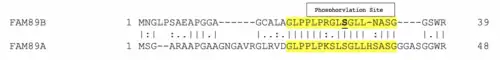 FAM89A has three predicted phosphorylation sites located at amino acid positions 30, 32, and 168 that are conserved in distant orthologs.[32] The predicted phosphorylation site at position 32 is experimentally verified at position 28 in its paralog, FAM89B.[33] There is a possible competitive binding site for phosphorylation and O-linked β-N-acetylglucosamine (O-GlcNAc) at position 158,[34] supporting localization of FAM89A in the nucleoplasm.[29][30]