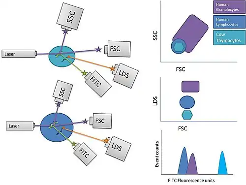 Unlike Q-FISH, Flow-FISH utilizes the quantitative properties of telomere specific PNA probe retention to quantify median fluorescence in a population of cells, via the use of a flow cytometer, instead of a fluorescence microscope.[14] The primary advantage of this technique is that it eliminates the time required in Q-FISH to prepare metaphase spreads of cells of interest, and that flow cytometric analysis is also considerably faster than the methods required to acquire and analyze Q-FISH prepared slides. Flow-FISH thus allows for a higher throughput analysis of telomere length in blood leukocytes, which are a readily available form of human tissue sample. The most recent versions of the flow-FISH technique include an internal control population of cow thymocytes with a known telomere length detected by TRF or telomere restriction fragment analysis to which the fluorescence of a given unknown sample may be compared. Because cow thymocytes take up LDS751 dye to a lesser extent than their human counterparts, they may be reliably differentiated via plotting and gating the desired populations. Other cell types that have not in the past proven to be good candidates for flow-FISH can be analyzed via extraction of nuclei and performance of the technique on them directly.[15]