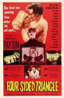 Four Sided Triangle is a 1953 British second feature ('B')[4] science-fiction film directed by Terence Fisher. It was written by Paul Tabori and Fisher, adapted from the 1949 novel by William F. Temple.[5][6] It stars Stephen Murray, Barbara Payton, John Van Eyssen and James Hayter.[7] It was produced by Hammer Film Productions at Bray Studios from August to September, 1952, and foreshadowed Hammer's later entrance into horror and science fiction.[6] The story concerns two scientists who invent a replication machine and duplicate a woman. J. Elder Wills was the art director. It was at this time that James Carreras announced that future Hammer films would be produced by either his son Michael Carreras or Anthony Hinds on a rotating basis, resulting in almost continuous filming.[8]