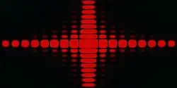 The form of the diffraction pattern given by a rectangular aperture is shown in the figure on the right (or above, in tablet format).[13] There is a central semi-rectangular peak, with a series of horizontal and vertical fringes. The dimensions of the central band are related to the dimensions of the slit by the same relationship as for a single slit so that the larger dimension in the diffracted image corresponds to the smaller dimension in the slit. The spacing of the fringes is also inversely proportional to the slit dimension.