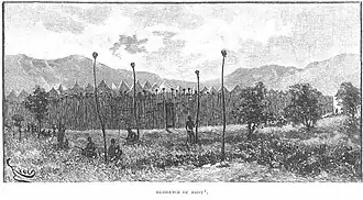 Arnot recovered his health while staying at Bailundu, inland from the coast in Ovimbundu territory, as the guest of some missionaries from the American Board of Commissioners for Foreign Missions. Messengers arrived there from the chief Msidi (Msiri), who ruled a large area in what is now Katanga Province in the Democratic Republic of the Congo, with its capital at Bunkeya. Msiri invited the white men to visit his Garenganze kingdom. On 3 June 1885 Arnot set out with a caravan of forty bearers and supplies for two years, reaching Bunkeya on 14 February 1886.[1] When Arnot arrived he had no food left, no trade goods and no white companions. He received a warm welcome, however, although Msiri discouraged his missionary work for fear it would make his subjects disloyal.[12]
