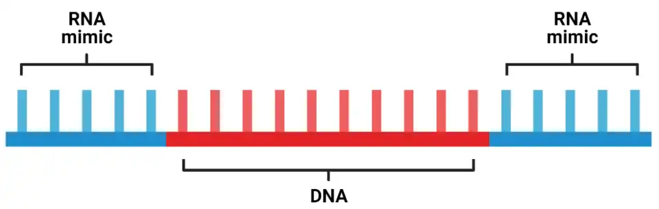 Gapmers are composed of short DNA strands flanked by strands of RNA mimics. The mimics are typically composed of locked nucleic acids (LNA), 2'-OMe, or 2'-F modified bases.[2] LNA sequences are RNA analogues "locked" into an ideal Watson-Crick base pairing conformation. Gapmers often utilize nucleotides modified with phosphorothioate (PS) groups.[4][3]