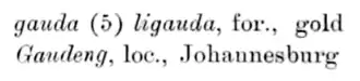 A snippet of text showing the Sesotho word "Gaudeng" (modern Gauteng) in Jacottet's A practical method to learn Sesuto: with exercises and a short vocabulary, published in 1906