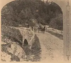 The Gilsum Stone Arch Bridge carries Surry Road over the Ashuelot River in Gilsum, New Hampshire. Built in 1862–63, it is one of the highest stone arch bridges in the state. It has a span of 47 feet 8 inches (14.53 m), and an average height over the river of 36 feet 6 inches (11.13 m). The roadway is 43 feet 6 inches (13.26 m) above the riverbed. It stands on the site of four previous bridges, where the river passes through a deep gorge. The previous bridge was also a stone arch bridge, which was built in 1860 and collapsed (due to inferior construction) a few months later. It was designed by William Leonard Kingsbury, a local official; its builders are not known because the town's records were destroyed in a fire. The present bridge's vault is carefully constructed from dry-laid granite voussoirs that were shaped for a very precise fit, with larger stones at the lower ends of the arch, and a smaller ones at the crown. Some of the stones were left with rough surfaces, while others were hammered smooth.[2]