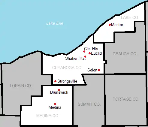The current roster of members include four schools from Cuyahoga County (Euclid, Cleveland Heights, Shaker Heights, and Strongsville), two from Medina County (Brunswick and Medina), and one from Lake County (Mentor). The departed schools were from Lorain County (Elyria) and Cuyahoga County (Solon).