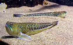 On its dorsal side Trachinus draco is coloured in a greenish brown with a varying count of dark marks on the upper side of the head. The flank is hued in a yellowish brown with bright blue and yellow discontinuous stripes that run crooked to the front of the fish.[8] Additionally oblique black stripes can be found laterally. This pattern is described as tiger-like by Horst Müller.[7]