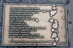 - ^ "The Sydney Morning Herald, WELLINGTON, Sunday - The exiled Chinese poet Gu Cheng, whose name had been put forward as a possible Nobel Prize contender, hanged himself after killing his estranged wife with an axe in New Zealand, police said today. Gu Cheng, 37, killed his wife, Xie Ye, 35, on Friday outside a house on the picturesque Waiheke Island - near Auckland - where she had been staying, Detective -Inspector George Wood said. The poet was found hanged from a tree". 11 October 1993 – via groups.google.com.