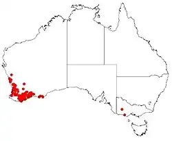 Found widely in Western Australia bounded by Jurien Bay, Kalgoorlie and Cape Arid National Park. Grows in heath or woodland on sand and loans with clay and gravel along road verges, in waterways and creek gullies. This species may grow into impenetrable thickets good for wildlife habitat.[3]