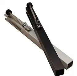 Handchimes are musical instruments which are rung by hand, similar to handbells. Typically, they are tuned square tubes with an external clapper mechanism.[1] Many handbell techniques can also be applied to handchimes,[2] though some are more difficult (such as six-in-hand) or impossible (malleting). On a music score, handchimes are indicated by a diamond shape on each note as opposed to an oval shape.[3]