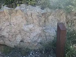 The Harding pegmatite intrudes along the boundary between the amphibolite and schist facies of the Vadito Group.[2][3] The various outcroppings form a belt about 2500 feet long and 150 to 500 feet wide. Radiometric ages are somewhat discordant, ranging from 1260 Mya for four Harding muscovites to 1350 Mya for a Harding lepidolite. A more recent "average age" is given as 1336 Mya, and discrepancies may be due to contamination from the host rock.[1] However, the pegmatite is thought to be up to 100 million years younger than any nearby granite plutons and does not seem to be genetically associated with any of them.