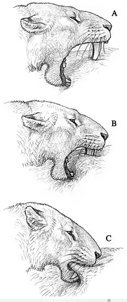 It has been suggested that Homotherium killed prey by slashing bites to the throat inflicted by its canines,[53] with Homotherium like other sabertooths thought to have been capable of a wider gape than living cats to accommodate enveloping the large canine teeth around its prey.[46] Like other sabertooth cats, Homotherium is widely thought to have used a "canine shear bite" technique, where, once the prey was immobilized and the jaws opened around the throat of the prey, the neck muscles of Homotherium were used to force the skull and the saber canine teeth downwards, more specifically via a downward rotation of the skull, to puncture the throat of prey.[45][54][55] These throat bites would likely have caused massive blood loss resulting in rapid death.[45][56] The elongate and strong neck likely allowed fine control enabling the head to be precisely located, orientated and held in position for the bite, allowing the canine saberteeth to avoid hitting bone which could damage them.[45][55] However, some recent authors have suggested that its style of prey restraint was probably different to that of Smilodon (which had more powerful forelimbs which helped to better restrain prey) with a killing technique more similar in some aspects to the clamp-and-hold technique used by living big cats like lions, with the saber teeth of Homotherium better able to resist sideways directed forces induced by struggling prey without fracturing than those of Smilodon.[53] Dental microwear analysis of specimens of H. serum from North America suggests that Homotherium regularly consumed tough-fleshed prey, but only engaged in defleshing and did not engage in bone crunching/crushing, similar to cheetahs but unlike living lions and hyenas.[48]