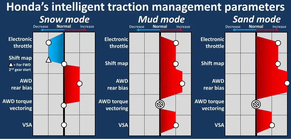 - Intelligent traction management—which offers different drive modes normal and snow for front-wheel drive (FWD) and adds mud and sand for all-wheel drive (AWD) that adjusts throttle mapping, shift points, power distribution, and Vehicle Stability Assist (VSA) responses—(all models):,