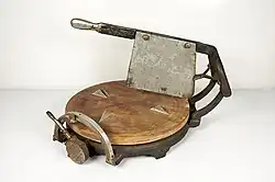 Hoop cheese was once so common that a device called a hoop cheese cutter was manufactured and used in general stores during the late 19th and early 20th centuries.[12] The hoop cheese cutter was patented in 1905 in the United States and resembled a turntable with a knife blade suspended above it.[13] It was built by scale companies of the period to cut to order the exact amount of cheese a customer wanted.[14]