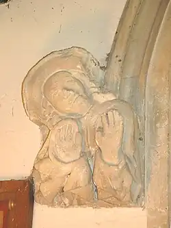 The Church of England parish church of Saint Giles seems to have been built late in the 12th century. The Early English Gothic[7] south aisle, including the south door and three and a half bay south arcade date from this period. From this time the east wall of the chancel had a trio of three stepped lancet windows. The early Decorated Gothic south transept was added late in the 13th or early in the 14th century[7] as a chantry chapel. The south porch was added late in the 14th century.[3] Around 1400 the present west tower and tower arch were built. The tower arch features two unusual almost life-size sculptures of human figures: one playing the bagpipes and the other showing an expression of amazement.[7] Also in the 15th century the pitch of the nave roof was greatly reduced in typical Perpendicular Gothic style.[7] Late in the 15th century, Perpendicular Gothic windows were inserted in both sides of the chancel and the north wall of the nave. The Perpendicular Gothic piscinae in the chancel and south transept are also 15th century.[3]