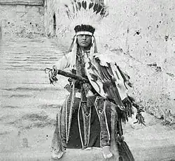 Howling Wolf (Cheyenne: Ho-na-nist-to, c. 1849–July 5, 1927) was a Southern Cheyenne warrior who was a member of Black Kettle's band and was present at the Sand Creek Massacre in Colorado. After being imprisoned in the Fort Marion in Saint Augustine, Florida in 1875, Howling Wolf became a proficient artist in a style known as Ledger art for the accounting ledger books in which the drawings were done.