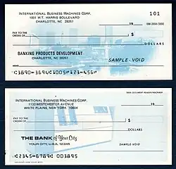 A number of technologies were developed by companies like EMI in the UK (Figure Reading Electronic Device or FRED), and Bull in France (CMC-7) to make cheques machine readable by means of pre-printed characters or characters that were inscribed on the cheque when it was being proofed at the Branch. IBM Poughkeepsie lab under J.A. Weidenhammer meanwhile was working on developing equipment that could mechanically feed, transport and stack paper checks, because they could not be handled using existing techniques then being used with punched cards. They created a system of friction wheels and belts to achieve this.[3] Meanwhile, another group within IBM collaborated with Weidenhammer on developing a machine readable magnetic ink barcode, printed below human readable numerals, which they demonstrated to Barclays Bank in 1957.[4] But after much industry consultation, the E-13B MICR font developed by General Electric as part of a solution sold to Bank to America became the American Standard adopted by the ABA in 1958. The ABA had previously concluded that IBM's proposed marking system would be too costly and also, that it was visually unattractive. After some hesitation, IBM developed their own multi-track read head for MICR characters and switched to using E-13B.[3] In 1959 they began promoting the IBM 1210. IBM Supplies division (that also manufactured punched cards) also saw an opportunity in this period to sell paper checks, printed by IBM in an IBM Plant.[5]