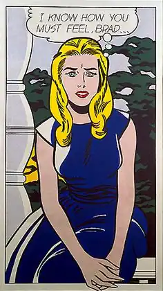 Measuring 174 cm × 95.9 cm (68.5 in × 37.75 in), I Know...Brad is considered an ironic depiction of emotional expression.[3] The work is a three-quarter-length, single image of a lovelorn girl.[4] This is one of Lichtenstein's post-1963 comics-based women that "...look hard, crisp, brittle, and uniformly modish in appearance, as if they all came out of the same pot of makeup."[5]