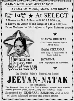 Jeevana Nataka (ⓘ) is a 1943 Indian Kannada film directed by Wahab Kashmiri, based on a play of the same name written by A. N. Krishna Rao.[2] The film was produced by Gubbi Veeranna, his first as an independent producer. Veeranna also appeared in a lead role in the film alongside debutante Kemparaj Urs, Shanta Hublikar and B. Jayamma.