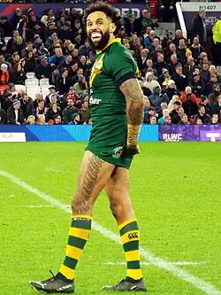 Addo-Carr was selected in the 24-man squad for the Australian Kangaroos by Mal Meninga to travel to England to compete in the 2021 Rugby League World Cup.[44] He proved the critics wrong, as journalist Paul Crawley said in response to Brad Fittler's controversial decision to not select him for the 2022 State of Origin series: "so from a Canterbury recruitment perspective and Gus is talking about having all this money that is available in 2024, what rep player or future rep player with half a clue would want to go to the Bulldogs knowing it could be the end of your representative career if you go there?"[45] He was accompanied by Canterbury-Bankstown Bulldogs five-eighth Matt Burton, both representing the Belmore-based club.