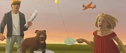 By the early 1990s, Raphael turned to the figure, taking childhood as a subject in sometimes-startling paintings examining myths and realities of gender and identity.[19][5][28] These narrative works depicted impassive figures—most often girls and young women in enigmatic, vaguely disturbing or ritual-like situations with older men or boys (e.g., Daddy's Girl or In Motion, 1996).[19][12][7][9] Carol Becker wrote of the former, "Enigmatic paintings like this one capture the dramatic and traumatic experiences of childhood, whose residue a child carries into adulthood and the adult often cannot transcend"; New York Times critic Vivien Raynor described such works as "capturing the weirdness of Balthus."[8][7] Raphael extended this theme in a series of large, ambiguous beach paintings depicting play in Lake Michigan that suggested imminent danger and adult neglect (e.g., Falling Child, 1992).[8]