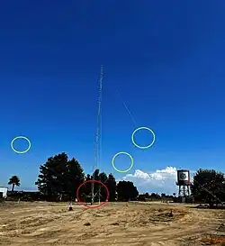 NEW Transmitter Site 2024: From Ish Pisher Facebook Post: One of the most unique new AM stations in the entire United States.... KWRM 1370AM Radio (Corona-Los Angeles) just went on the air utilizing a 100-foot tower with a new umbrella-skirt design, the creation of Ben Dawson (Hatfield & Dawson) and Dr. Bobby Cox (Kintronic). Located close to an (Chino) airport, the 100 foot height was a perfect reason to use the skirt (shown where it connects by way of the circles) and has given the station outstanding bandwidth and enhanced coverage from its 1.1 kW days/ 240 nights over the Los Angeles-San Bernardino-Riverside metros.