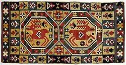 The Marby Rug is a knotted-pile carpet found in a church in Jämtland, central Sweden in 1925. It is believed to have come from fourteenth- or fifteenth-century Anatolia. It depicts pairs of birds facing a tree, under the wings of a great bird, and is the only known Eastern rug with this design.[3] Multiple Swedish textiles copied this design, possibly copying this specific rug, and one such cross-stitch embroidery is in the Khalili Collection.[31]