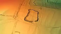 Possible associated landscape features also include for extensive surrounding field systems, boundary earthworks, ponds, two corn-drying kilns, and the outline of a possible small amphitheatre, or circus.[5][7]