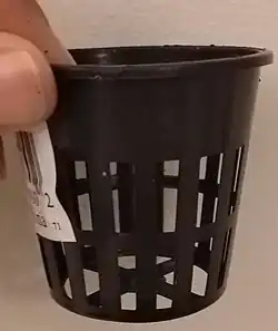 Plants are placed in net cups filled with an inert growth medium such as rock wool, expanded clay aggregate, sphagnum moss, or coconut coir.[5][6] The net cups are suspended above a reservoir of water containing essential nutrients in solution.[7] Only the root tips are allowed to touch the surface of the reservoir. As the plant grows and depletes the water level, a gap of moist air will form and expand between the water surface and the base of the plant. The roots in this gap become laterally branching "oxygen roots," and absorb oxygen from the air inside the container.[8] By the time the water level is fully depleted, the plant should be ready to harvest. Thus, in one growing cycle, no additional replenishment of water or nutrients is needed beyond the initial application.[9]