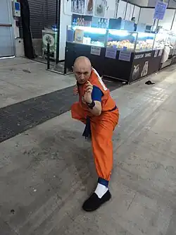 Krillin's appearance stays relatively the same for the majority of the series. He is first introduced at age 13, with a shaved head and still dressed in the yellow-and-orange clothing worn at the monastery at which he had been training. He does not possess a visible nose, and has six spots of moxibustion burns on his forehead called jieba, a reference to the practice of Shaolin monks. Toriyama once stated, seemingly humorously, that Krillin's lack of a nose is because he has a "physical idiosyncrasy" that allows him to breathe through the pores of his skin.[10] Later, he wears the orange gi uniform that is presented to both himself and Goku by Master Roshi in honor of their first martial arts competition.[11] Occasionally, he is seen in casual clothes, but for the most part, continues to dress for training or fighting at all times.[12] During the Frieza arc, he wears Saiyan armor provided by Vegeta,[13] but during the Cell arc he returns to wearing the orange gi, accompanied by a blue short-sleeved undershirt and boots.[14] After the defeat of Cell, Krillin stops shaving his head and grows his black hair out, before later shaving it again during Frieza's resurrection.[15] When he settles down with his family, Krillin is shown wearing a workout outfit consisting of a red "Tacos" T-shirt and brown drawstring pants.[16]