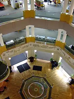 The Library's facade includes rose-colored granite, with large windows facing the street and Phoenix Park. A rotunda in the lobby, the focal point of the building, spans all five floors and houses a Foucault pendulum and frieze designed by Lexington sculptor Adalin Wichman[1] depicting the history of the horse in the Bluegrass. Included within the complex is the 138-seat Farish Theater, meeting rooms and an atrium reading lounge. An art gallery is located on the ground floor.