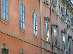 - Built in the medieval period and renovated in the 18th century by architect Antonio Veneroni (in collaboration with the Sartorio brothers), it is characterized by a massive and austere structure[88]. Noteworthy is the courtyard with paired columns[89]. The elegant interior features some rooms decorated in the 18th century: notable are the former episcopal chapel and the frescoes by Carlo Innocenzo Carloni[89].