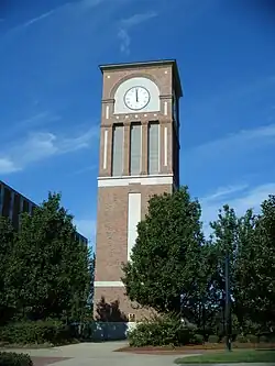 Another popular location on the Main Campus is Centennial Plaza. In 1994, Centennial Plaza was constructed to commemorate the 100th anniversary of Louisiana Tech's founding. The plaza was funded by a student self-assessed fee and designed specifically for the use and enjoyment of the student body. Centennial Plaza is used for special events throughout the year, such as Christmas in the Plaza, movie events, and student organizational fairs. Centennial Plaza is one of the main gathering points of the students due to the plaza's close proximity to the on-campus restaurants, coffee shops, dining halls, university post office, and offices for Student Life, SGA, and Union Board. At the center of the plaza is the Clock Tower which has the sound and digital capabilities to play the Alma Mater, Fight Song, and any other songs and calls as needed. The Alumni Brick Walkway runs through Centennial Plaza and around the Clock Tower.[28] A large Louisiana Tech seal marks the middle of Centennial Plaza just west of the Clock Tower. Centennial Plaza is enclosed by Tolliver Hall, the Student Center, Howard Auditorium, and Harper Residence Hall.