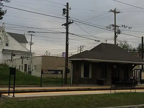 Between the MacDade Boulevard and Sharon Hill stops, CSX's Philadelphia Subdivision freight line bridge crosses over the tracks.[1] The line dips very low under the freight line as a result, flooding occurs in the underpass with shuttle buses between the two stations being used as substitutes for trolley cars.