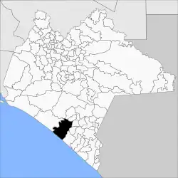 The municipality covers an area of 1,085 square kilometres (419 sq mi), representing 19.81% of the Soconusco region and 1.44% of the state of Chiapas. It stretches from the Pacific Ocean to the Sierra Madre de Chiapas mountain range, with a maximum altitude of 2,700 m (8,900 ft) above sea level (a.s.l.). The highest peaks are La Cumbre, La Bandera and El Pujido. Mountainous and hilly terrain makes up approximately 50% of the area of the municipality, with low foothills accounting for another 10%. 40% of its territory lies on the Pacific coastal plain, and some 6% of this area is alluvial floodplain and saltmarsh. Alluvial soils predominate.[8][7]
