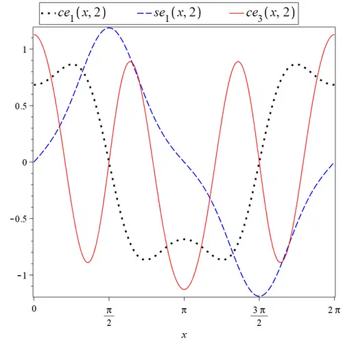 In some usages, Mathieu function refers to solutions of the Mathieu differential equation for arbitrary values of and . When no confusion can arise, other authors use the term to refer specifically to - or -periodic solutions, which exist only for special values of and .[5] More precisely, for given (real) such periodic solutions exist for an infinite number of values of , called characteristic numbers, conventionally indexed as two separate sequences and , for . The corresponding functions are denoted and , respectively. They are sometimes also referred to as cosine-elliptic and sine-elliptic, or Mathieu functions of the first kind.